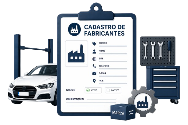 O fabricante, como por exemplo CHEVROLET, representa a origem dos veículos, peças ou equipamentos vinculados aos atendimentos. Esse cadastro é fundamental para organizar corretamente as informações do sistema, permitindo identificar padrões, facilitar filtros, relatórios e garantir maior precisão nos processos de manutenção, compra de peças e histórico dos serviços realizados.