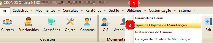 Para cadastrar um tipo de objeto, como Caminhão, Carro, Moto... Acesse o menu Utilitários > Tipos de Objetos de Manutenção.