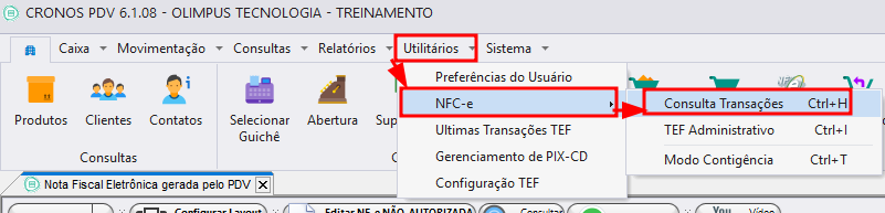 Caminho para acessar o menu gerenciamento de notas. Utilitários > NFC-e > Consulta Transações. Ou o atalho no teclado CTRL+H