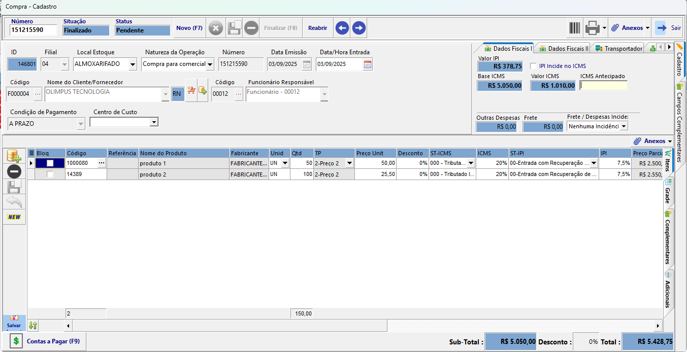 Na tela abaixo, temos a nota de compra nº 151215590, com dois produtos adquiridos.