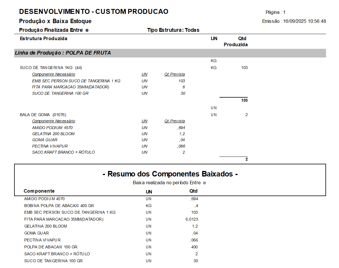 O relatório Produção x Baixa de Estoque tem como objetivo cruzar a quantidade de produtos fabricados com os componentes baixados do estoque, com base no previsto pela estrutura.