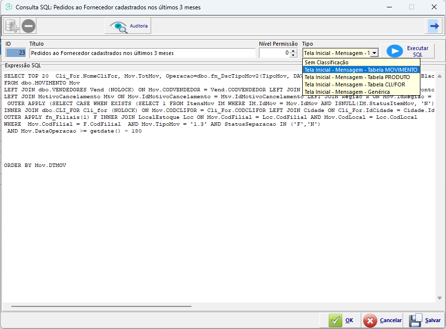 - Tipo (vinculação com tela, como "MOVIMENTO", "PRODUTO", "CLI/FOR")