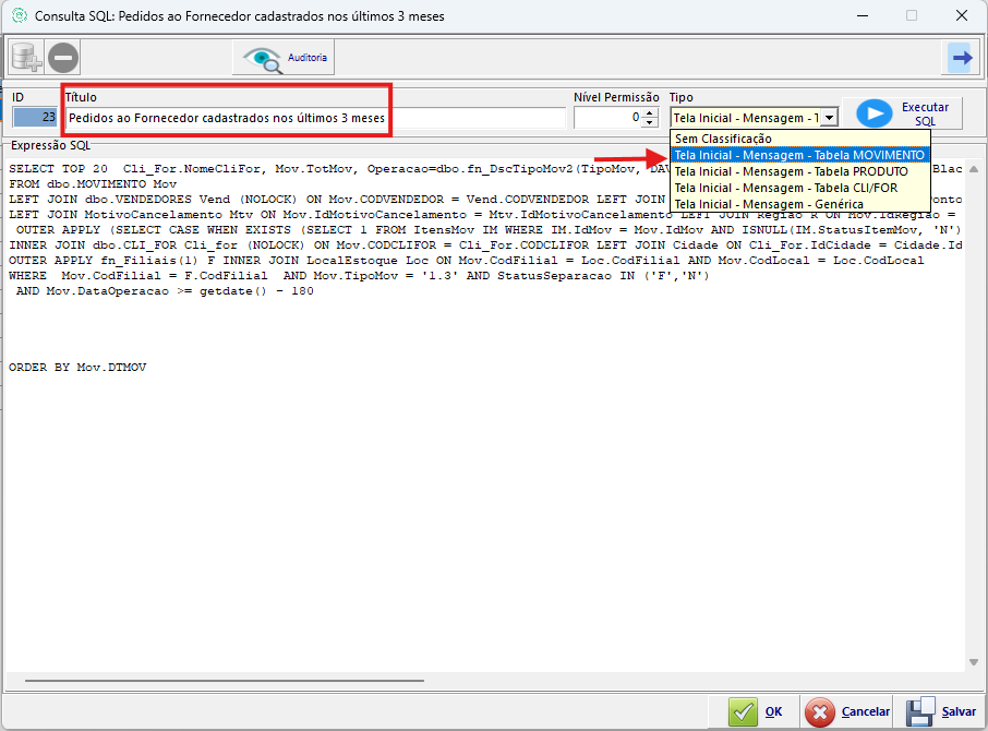 - Defina o tipo de consulta (por exemplo, “Tela Inicial - Tabela MOVIMENTO”) - mais à frente explicaremos melhor esta rotina!