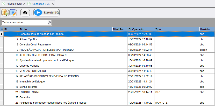 Você verá uma tela com todas as consultas SQL já cadastradas, contendo: